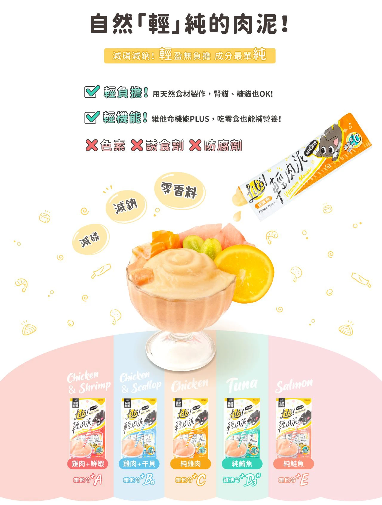 V 無添加色素、誘食劑、防腐劑